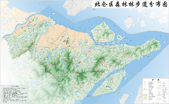 目前,八大坑笑天龙森林步道、九峰山森林步道、孝子岭古道、太白山森林步道、茅岭古道;虾蜡龙潭森林步道、日头山森林步道;里外峰岭;东盘山森林步道;云雩山森林步道;老鹰山森林步道;小港依山村至茅洋寺森林步道;凤凰山森林步道;郭巨总台山森林步道等15条森林步道,还有八大坑北仑最绿森林步道和春晓昆亭上车门鸟坑森林步道等,形成了纵连横合的二百余公里森林步道网络。