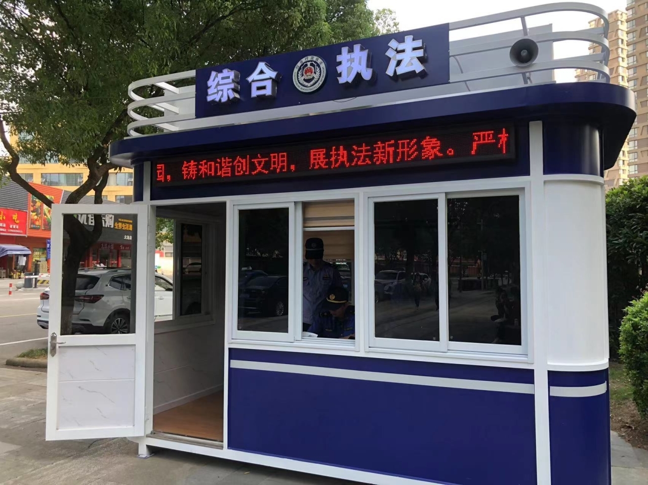 “您好,请问是综合行政执法部门吗?菜场附近有人行道违停情况,阻碍了行人交通……”接投诉后,就近的执法岗亭值班人员立刻到现场处理,全程只用了5分钟。近日,北仑城区出现了蓝白相间,门头上镶嵌着“综合执法”字样的移动执法岗亭。这是新碶街道综合行政执法队在辖区增设的3处移动执法岗亭。