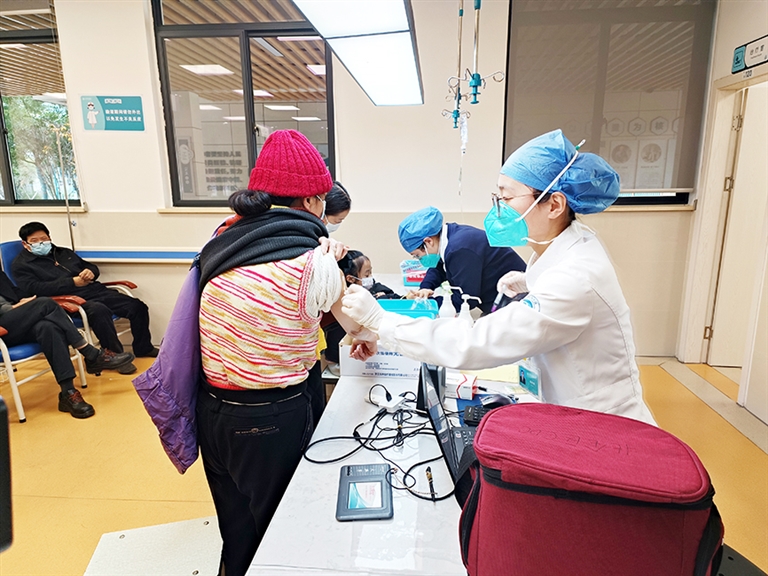“之前每日接种新冠疫苗二三十人次,以青壮年为主。自宁波市优化调整疫情防控相关措施以来,我们医院日接种两百多人次,80%接种人群为60周岁及以上老年人。”大碶街道社区卫生服务中心急诊护理护士长张幸说。