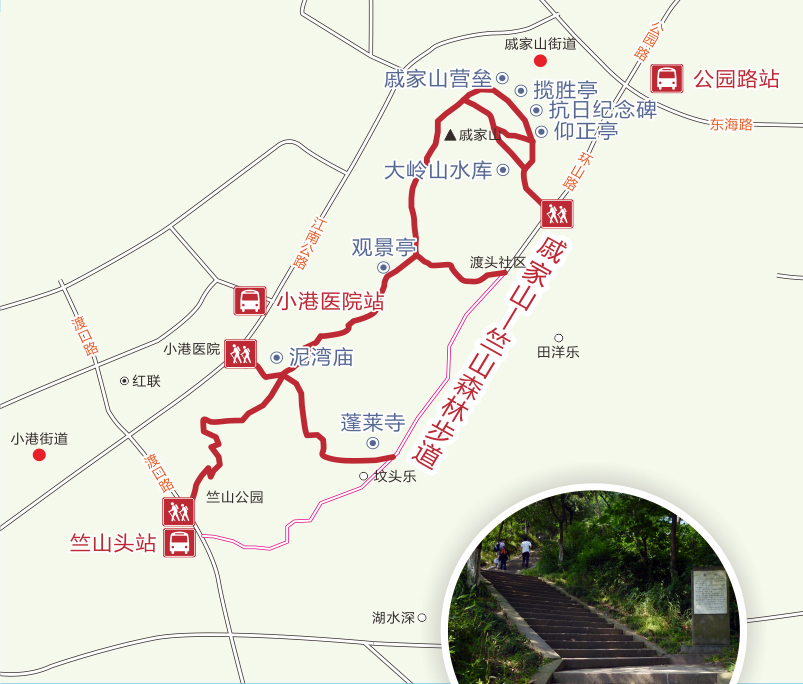 特色:城市休闲健身步道 可俯瞰戚家山 小港 远眺甬江 镇海